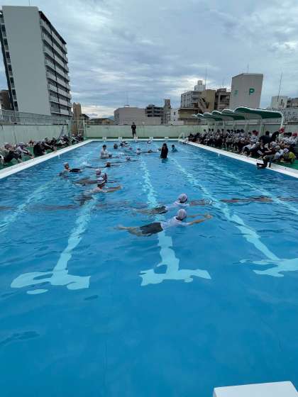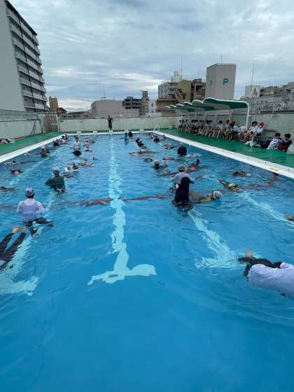 目的やどのような危険があるのか、またどう対処すればよいのかについて話を聞いた後、実際に服を着てプールに入りましたよ。