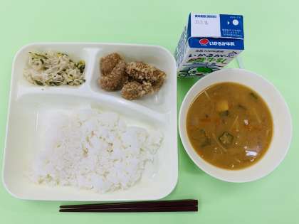 たつたあげは、豚肉にしょうが汁、酒、こいくちしょうゆで下味をつけ、でんぷんをつけて揚げています。みそ汁には、夏が旬のオクラのほか、野菜がたくさん入っていました。