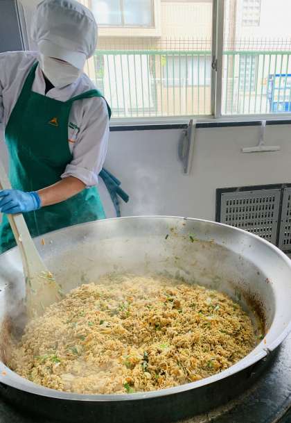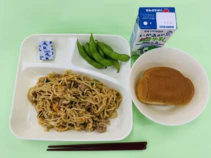 オイスターソース焼きそばは、中華風の焼きそばです。具材には豚肉やキャベツ、たまねぎなどのほかに、にらを入れており、味つけに塩、こしょう、こいくちしょうゆ、テンメンジャン、オイスターソースを使っています。大好評の献立でした!