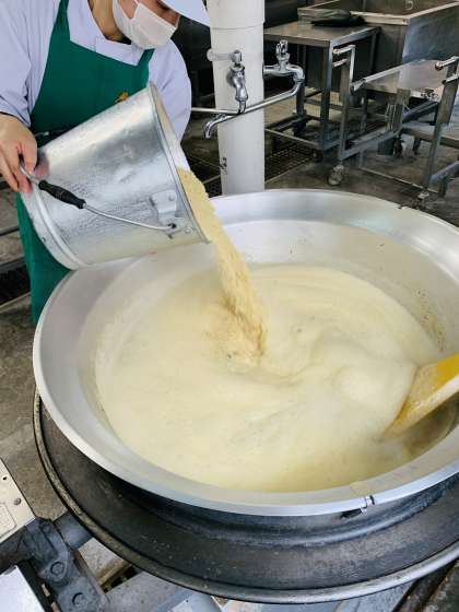 高野どうふは、骨や歯をじょうぶにする、カルシウムを多く摂ることができる食品です。給食では、粉状にした高野どうふを豚ひき肉やひじきなどといっしょにだしで煮て、砂糖やうすくちしょうゆなどで味つけしています。