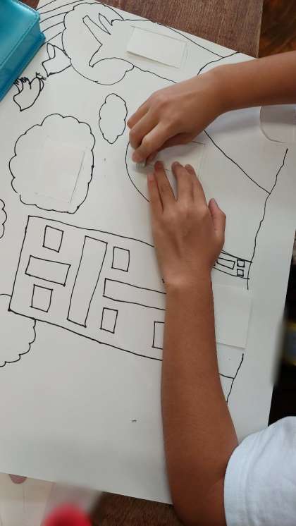 図画工作科では「まほうのとびらをあけると」に取り組んでいます。今回は、ネームペンで絵を描いた後、カッターで切り込みを入れて、扉の部分を差し込んで、開け締めができるようにしました。