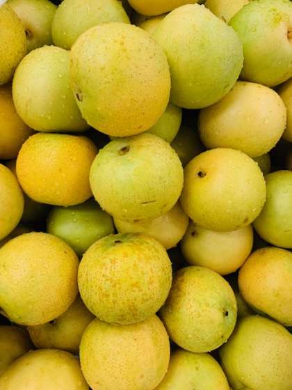 なしは、秋が旬のくだものです。日本のなしには、皮が茶色い「赤なし」と、皮が緑色の「青なし」の2種類があり、赤なしには幸水や豊水、青なしには二十世紀などの名前があります。シャリシャリした食感と、さわやかな甘みが特長です。