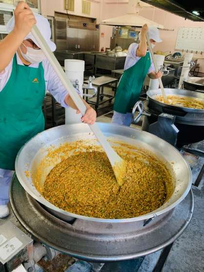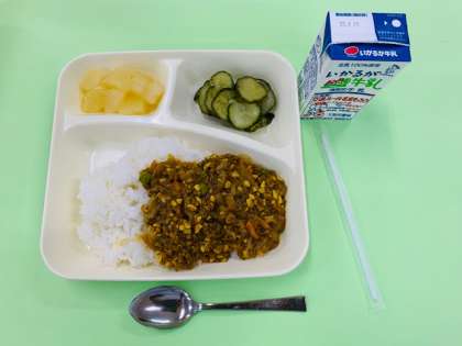 キーマカレーとは、ひき肉を使ったカレーのことをいいます。今日は、牛ひき肉と豚ひき肉のほかに、ひきわり大豆と豚レバーチップが入っていました。不足しがちな鉄を摂ることができるレバーは、貧血予防に効果的な食べものです。