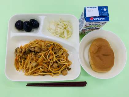 ぶどうは、今が旬のくだものです。皮の紫色はポリフェノールによるもので、抗酸化作用があるといわれています。今日は長野県から届いたぶどうでした。スパゲッティとともに、大人気でしたよ。