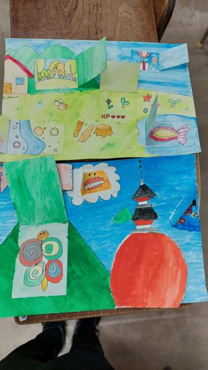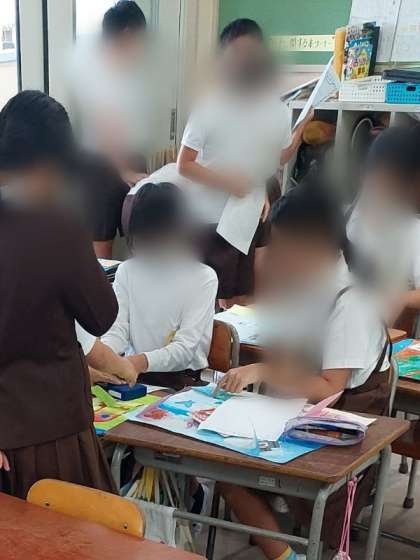 以前から取り組んでいた「まほうのとびらをあけると」が完成したので、鑑賞をしました。鑑賞した後は、友だちの作品の素敵な所を直接伝え合いました。