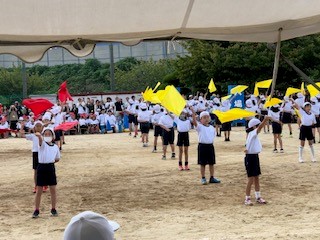 手に持った手具を隣りの子と合わせると形になったり、グループで隊形を組んだり、とてもおもしろかったです。