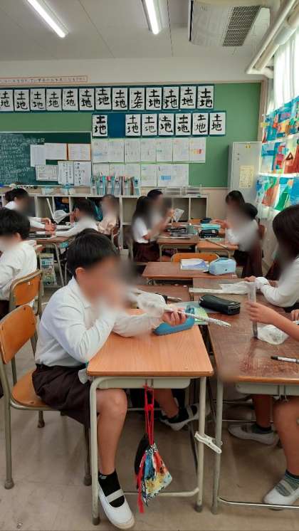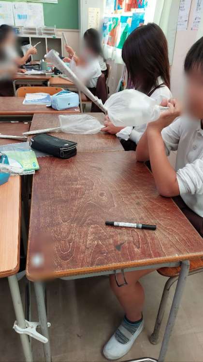 理科の学習で、筋肉と骨の関係を調べました。新聞紙と袋を使って、腕を曲げると筋肉が縮み、伸ばすと筋肉と伸びることを学習しました。