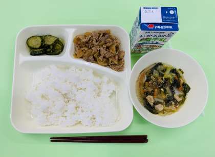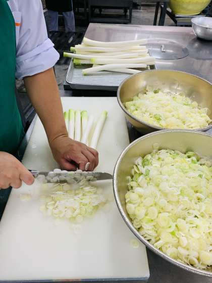 はるさめは、さつまいもやじゃがいも、緑豆という豆などから作られます。給食のはるさめは、じゃがいもから作られたもので、少し太めのもちっとした食感が特長です。(下写真は、スープに入る白ねぎを切っているところです。)