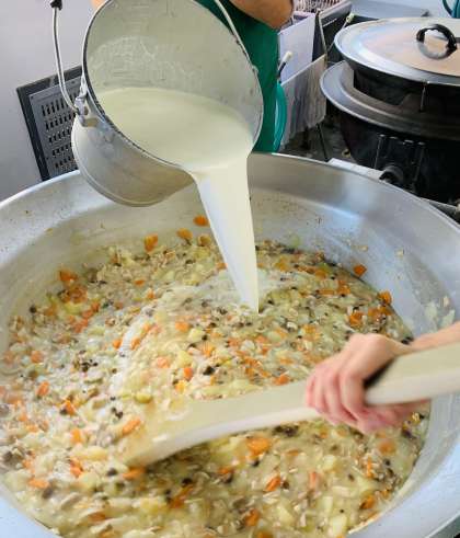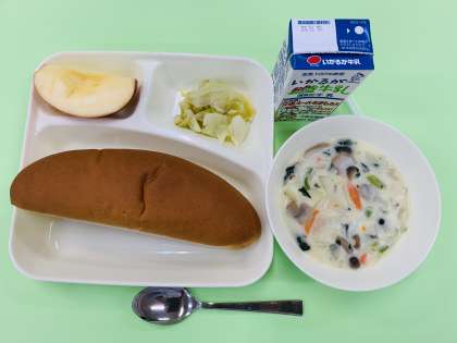 秋は、きのこがおいしい季節です。今日のシチューには、たっぷりの牛乳とともに、しめじ、エリンギ、マッシュルームの3つのきのこが入っていました。今日のりんごは、青森県産のサン富士という品種でした。