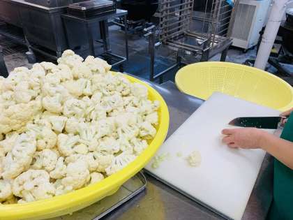 カリフラワーは、ブロッコリーと同じ花のつぼみを食べる野菜です。今日は、コーンといっしょにゆでた後、砂糖、塩、ワインビネガーで作ったタレに、熱いうちに浸けて、味をしみこませています。