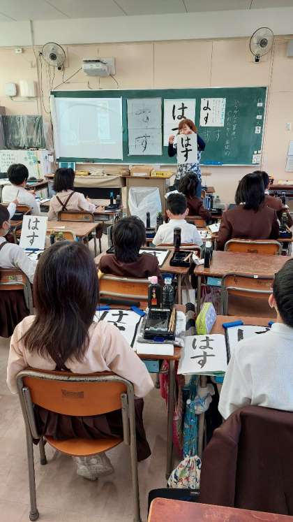 書写の時間に、「はす」という字を書きました。ひらがななので、漢字よりも文字のバランスや筆の動かしかたが難しいですが、お手本を見ながら頑張って書いていました。