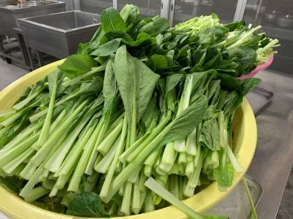 冬に近づくと、葉の野菜が旬を迎えます。今日は、たっぷりのこまつなをささみとともにいためています。ししゃもは、約30枚の鉄板(ホテルパンといいます)に50尾ずつ並べて焼いています。おうちで魚を焼くのと同じように、油や水分が落ちるように、ホテルパンには網を敷いています。