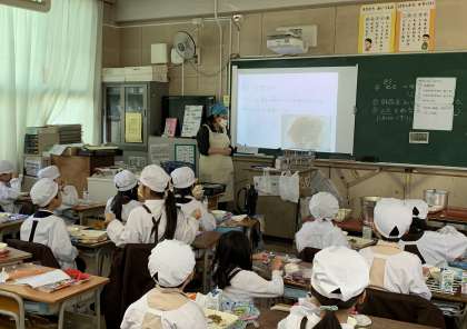 韓国・朝鮮料理のビビンバは、肉と野菜のナムルを別々で作り、ごはんにのせて混ぜて食べます。各クラスでは、給食時間に韓国・朝鮮料理についてのスライドを見てもらいました。11月はよくかんで食べる食品がたくさん登場します。いもけんぴフィッシュも、かみごたえがあり、いい歯をつくる食品の一つです。