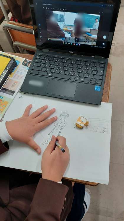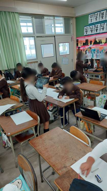 図画工作科では「忘れられない気持ち」を絵に表して描いています。まず、どんな出来事があって、その時に自分はどんな気持ちだったのかを考えました。そして、その気持ちが伝わるように、絵の構図を考えました。自分を描くために、タブレットのカメラを活用しました。