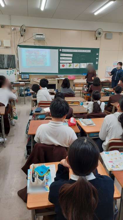 外国語活動では、食材や欲しいものを要求する時の言い方に慣れ親しむ活動をしました。単語をただ言うだけでなく、歌やスリーヒントクイズ、伝言ゲームなどで食材の言い方に楽しく慣れるような活動をしています。