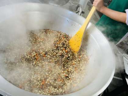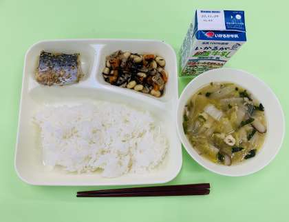 「ま・ご・は(わ)・や・さ・し・い」という言葉を知っていますか。健康的で栄養バランスのよい食事をとるために取りたい和の食材の覚え方です。「ま」は豆、豆製品、「ご」はごま、「わ」はわかめなどの海藻類、「や」は野菜、「さ」は魚、「し」はしいたけなどのきのこ類、「い」はいも類を指します。今日の給食には、これらすべての食材が入っていました。