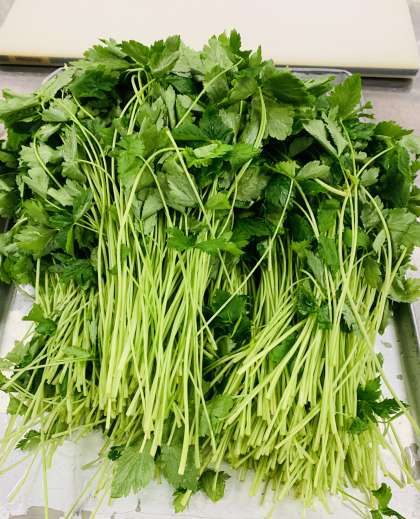 つみれ汁は、だいこんやにんじんなどの野菜とともに、いわしだんごを入れたみそ仕立てのものです。青みにみつばを入れています。寒くなってきたので、温かい汁もので体を温めてほしいと思います。