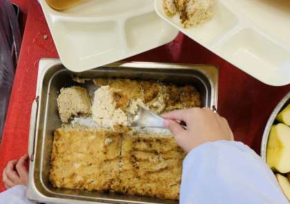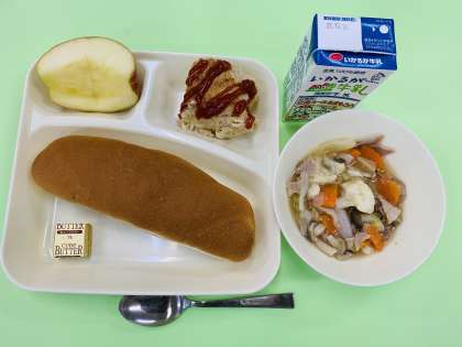 とうふローフは、ツナ缶やとうふ、粒状の大豆などを混ぜ合わせてミニバットに入れ、焼いています。各クラスでは、写真のように切れ目を入れて配膳し、ケチャップをつけて食べます。スープ煮に入っているカリフラワーは、今が旬の野菜です。