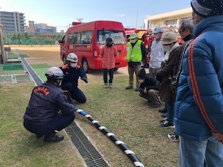 日曜日、区役所、消防署や地域の防災リーダーさんたちを中心に、地域の防災訓練を行いました。