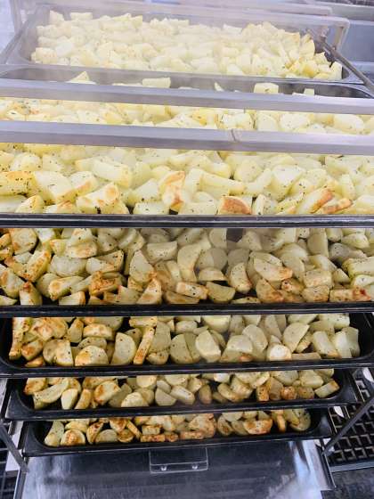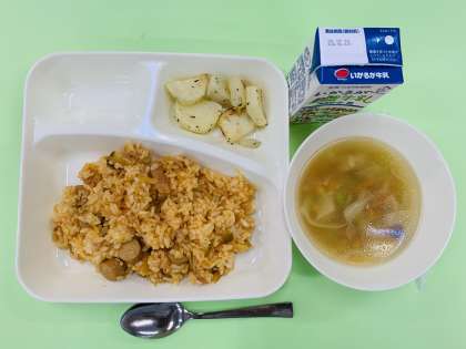 ケチャップライスは、初登場の献立でした。ウインナーとベーコン、たまねぎ、ピーマンをいためてケチャップやウスターソース、カレー粉などで味つけし、おさらに盛りつけたごはんにかけて、スプーンで混ぜていただきます。一年生は、「混ぜるの難しい〜!」と言いながら一生懸命混ぜていましたよ。大好評のメニューでした。