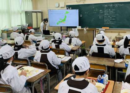 今日正月には、新年の始まりを祝い、「今年も元気に過ごせるように」との願いがこめられた料理がたくさんあります。ぞう煮は、地域によってもちや味つけに違いがあり、各クラスでは、ぞう煮マップでその違いを見てもらいました。