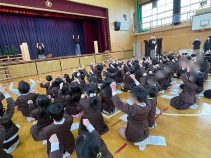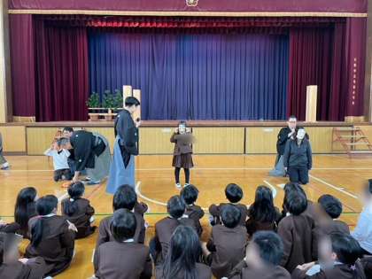 今日は能楽の芸術鑑賞がありました。小鼓や大鼓等、それぞれの楽器の説明を受け、「初めて知った!」「ただ叩いてるんじゃないんや!」など、子どもたちは興味津々でした♪