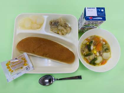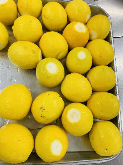 レモンマリネは、和歌山県から届いた冬が旬の生のレモンを、給食室でしぼって使っています。下味をつけたあじにでんぷんをつけて油で揚げ、いためたレモンと砂糖、塩、酢、白ワイン、レモン汁で味つけしたマリネ液をからませています。