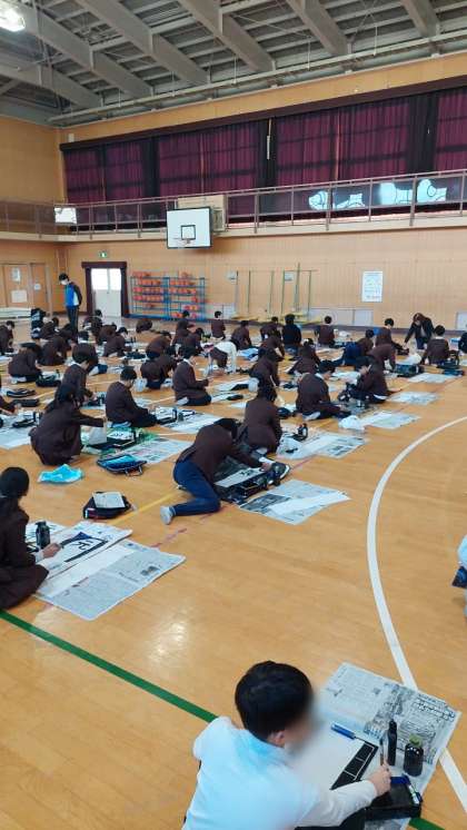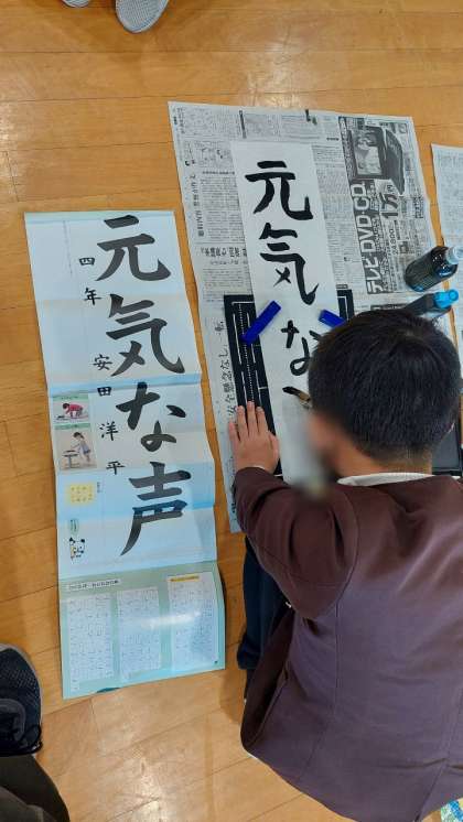 書写の時間に講堂で書き初めをしました。先週練習をしていたので、子どもたちは練習したことを思い出しながら、書いていました。