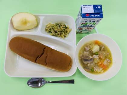 カレーソテーには、ささみが使われていました。ささみは、鶏肉のむねの部分にある肉のことで、脂肪が少なく、たんぱく質が多いのが特長です。今日のりんごは、長野県から届いたサンふじでした。