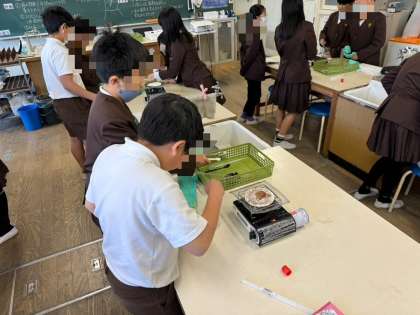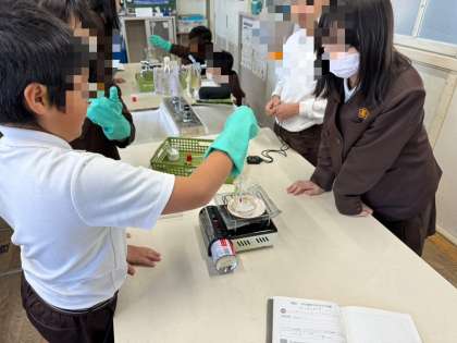 ガスコンロでビーカーを加熱したり温度を確認したりと、班のメンバーと協力して実験することができました♪