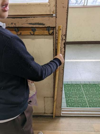 算数では、1mのものさしを使って、1mくらいの長さになるものを探しました。「ロッカーの高さ99cmや!」「フックの高さも1mくらいやで!」など、たくさん発見することができました。