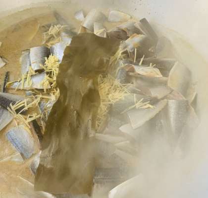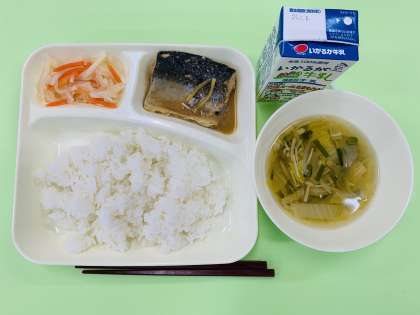 さばは、釜に調味液を入れ、千切りにしたしょうがを散らし、こんぶを落としぶたにして煮ています。煮くずれないように、ゆっくり釜をゆらし、周りの調味液をかけながらコトコト煮ています。骨の多い魚ですが、はしをじょうずに持って一生懸命骨を取る姿が見られました。ご家庭でも、骨のある魚を積極的に登場させてほしいと思います。