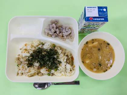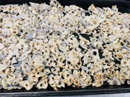 れんこんは、地下茎を食べる野菜です。便秘を予防する食物繊維や、風邪を防ぐビタミンCが豊富に含まれています。今日は、塩と綿実油をまぶして蒸し焼きにしています。