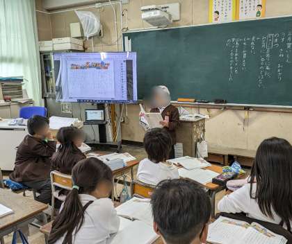 国語科では「かさこじぞう」を学習しています。手ぬぐいでほっかむりをすると気分はじいさま。じいさまの気持ちになりきって、音読していました。