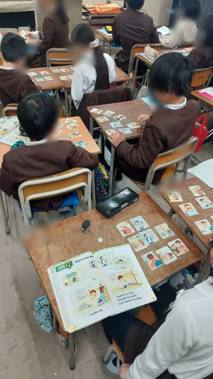 外国語活動の学習で、一日の出来事の言い方を学習しました。朝食を食べるやごみ捨てに行く、家を出るなどの英語での言い方を学習した後に、カードゲームをして楽しみながら言い方の確認をしました。