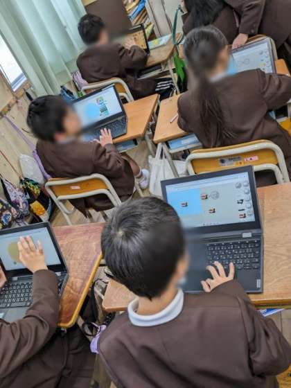 プログラミングの学習として、ビスケットに取り組みました。まずは、自分で絵を描き、その後、どんな風に動かすのかを考えました。自分で描いた絵にどんな動きにさせようか、子どもたちの試行錯誤が続きます。