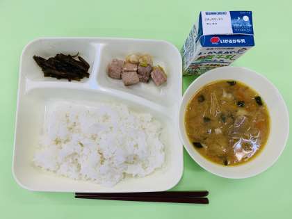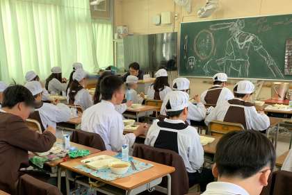 くきわかめは、わかめの葉の芯の部分で、コリコリとした歯ごたえが特徴です。写真は、6年生の「いただきます!」の様子です。小学校最後の給食まで、今日を含めて残り3回となりました。