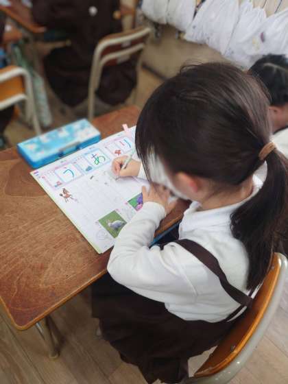 ぐー・ぺた・ぴんで姿勢を正し、鉛筆の持ち方に気をつけて、一画ずつゆっくりていねいに書いています。