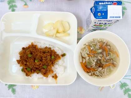 タコライスは、綿実油を熱し、にんにくを香りよくいため、牛ひき肉、豚ひき肉をいためます。更にたまねぎを加えていため、いたまれば、塩、こしょう、カレー粉、トマトピューレ、ケチャップ、ウスターソースで味つけし、最後にグリンピースを加えて、いためます。ご飯の上にかけて盛りつけたら出来上がりです。どのクラスも食缶が空っぽでした!!