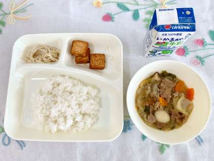 八宝菜は、うずら卵除去食対応の献立です。うずら卵を投入する前に、専用の食器にとり分けます。卵アレルギーの児童も安心して、みんなと同じ献立が食べられます。