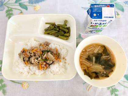なんと、今日の丼は、豚ひき肉と合わせています!こども達のために、栄養のことがしっかり考えられている給食、スーパーフードです☆