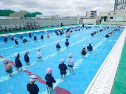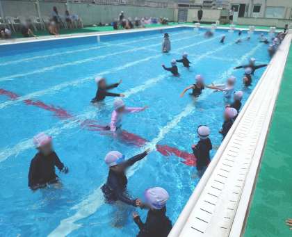 水慣れのダンスや運動をしたり、プールの中を歩いたり走ったりしました。