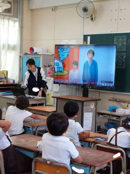 台風の映像を見たり、クイズに答えるなかで、「自分たちで台風にそなえないといけない」と学ぶことができました。