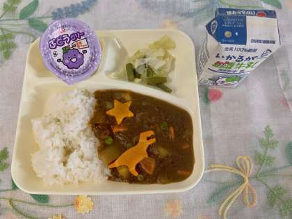 を盛りつけた上にカレーをかけて、できあがりです!今日は調理員さんが、かいじゅうのかたちのラッキー人参をいれてくださいました!あたった人はいるかな?土日ゆっくり休んで、月曜日また元気な顔で会いましょう!