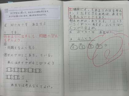 算数科「あまりのあるわり算」の学習をしました。問題場面によってあまりの処理のしかたが変わることを学びました。