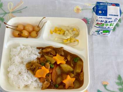 チキンカレーはラッキーにんじんが入っています。明日は、月見の行事献立なので、調理員さんがうさぎの形のラッキーにんじんを入れてくださいました!ありがとうございます。