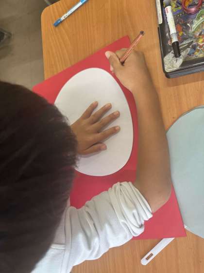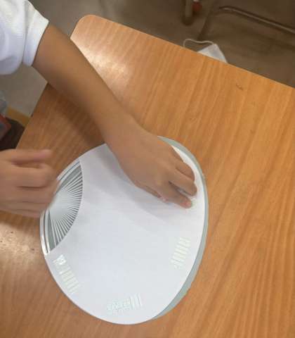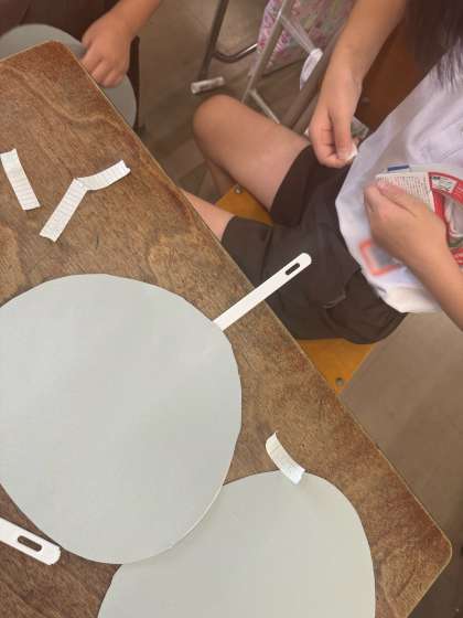 うちわに画用紙を貼り付けて、運動会のダンスで使用する手具を作りました。