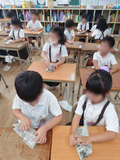 2時間目は新聞紙でスリッパやお皿を作り、いざというときに少しの工夫で役立つということを確認しました。