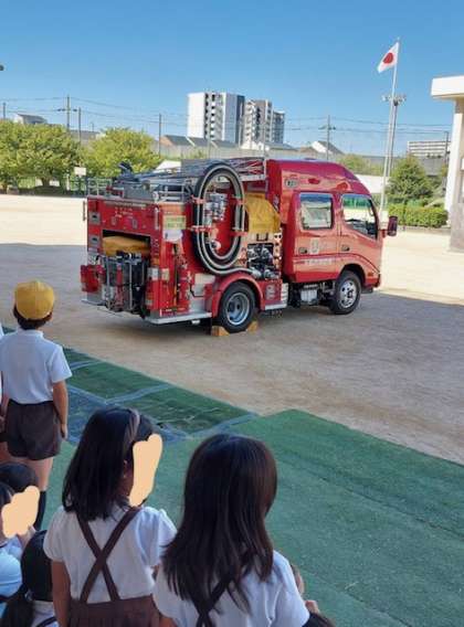 五年生の防災学習のためにきていた消防車に興味津々の2年生たち。「かっこいいー!」と歓声が上がっていました。