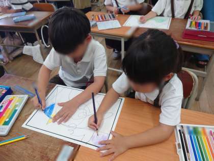 隣の友だちと交代し、1人2本の線を描いたあと、そこにできた模様がどんな形に見えるか、ペアで話し合いながら色を塗りました。